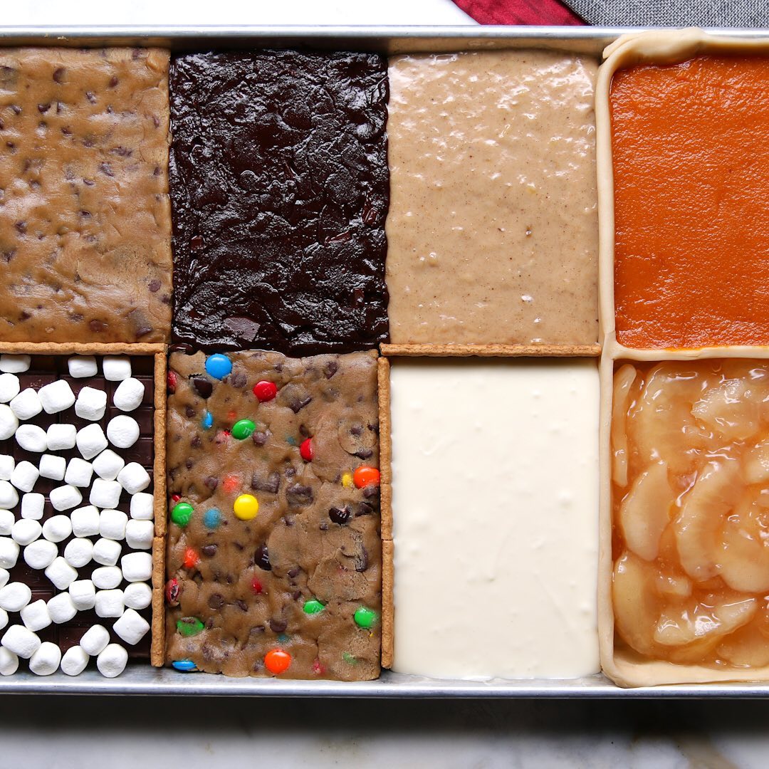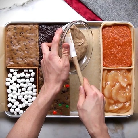3.天板を8等分にし、左上にチョコレートチップクッキーの生地を平らな長方形に成形してのせる。対角線上にマーブルチョコ入りのクッキー生地を長方形に成形してのせる。その上にブラウニーミックスを長方形に成形してのせる。