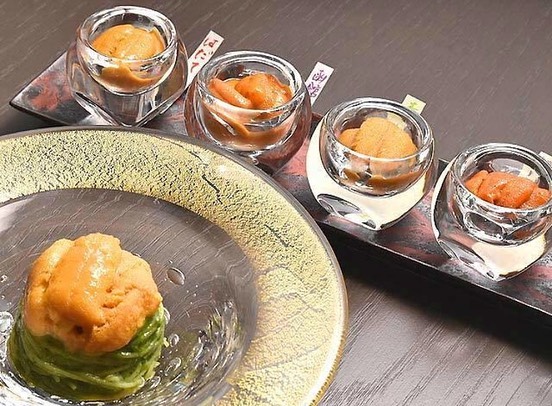 『海栗とワイン TSUKIHI』では全国から産地直送のうにを心ゆくまで堪能できる。コースの〆に選べる、名物「うにの冷製パスタ」は絶品だし、予約必須の炊き込みご飯も必食の美味しさだ。