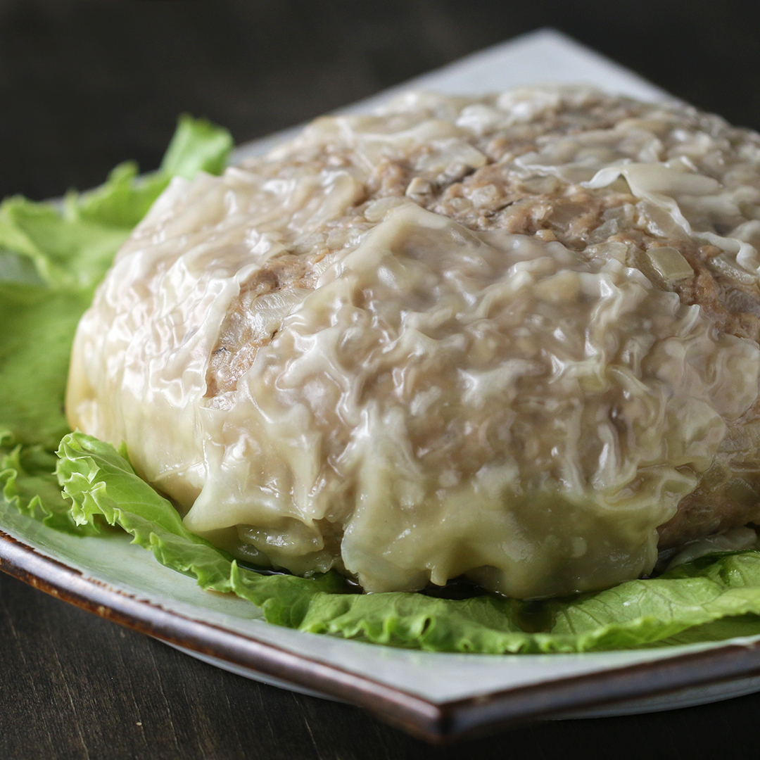 3. フライパンにレタスをしき、中央に(2)をのせる。熱湯を加えて、蓋をして中火で約10分蒸し焼きにしたら、完成!お好みでからしじょうゆをつけていただく。
