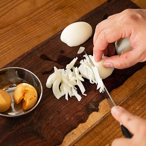 2)殻をむいて黄身と白身を分け、白身を薄切りにします。