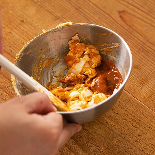3)ボウルに黄身とAを入れてよく混ぜ、さらに白身と「素材を生かしたカレー バターチキン」を加えてよく混ぜます。