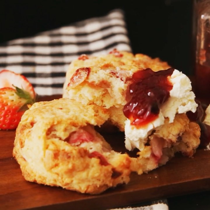 1. 小麦粉、ベーキングパウダー、塩、グラニュー糖を全てふるいにかけ、ボ ールで合わせる。バターを入れ、そぼろ状になるまで素早く手ですり合わ す。いちごと牛乳、ホワイトチョコレートを加え、合わせてひとまとめにす る。⠀