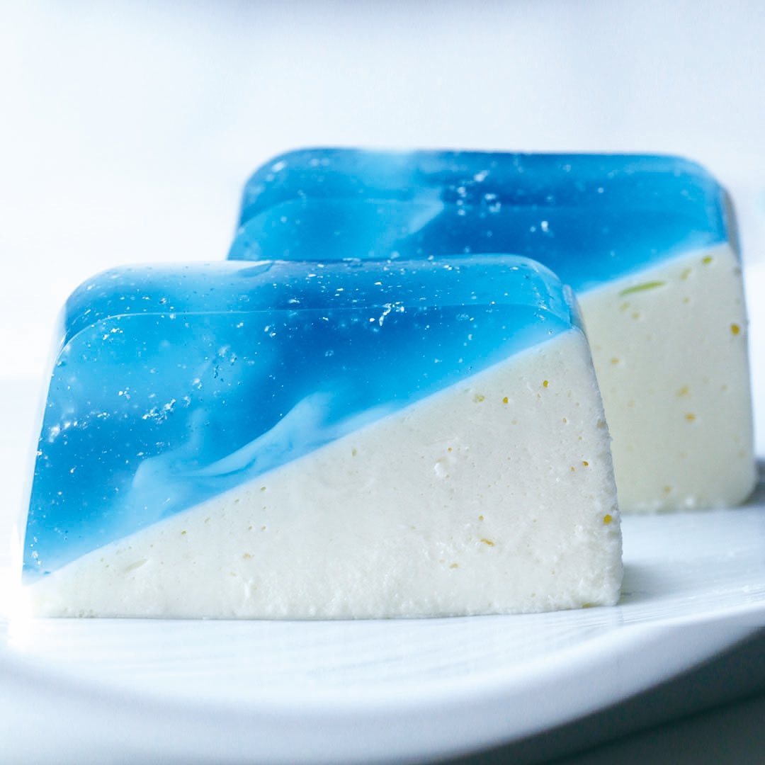 6.パウンド型を傾けて固定し、水色、青色のゼリー液の順に注ぎ入れる。白のゼリー液を少しずつ垂らしてマーブル状にし、冷蔵庫で1時間冷やす。