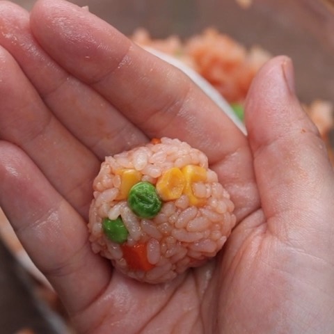1.ボウルにご飯、ミックスベジタブル、ケチャップ、コンソメを入れて混ぜ合わせ、6等分にする。たこ焼き器の穴よりも少し小さくなるように丸める。