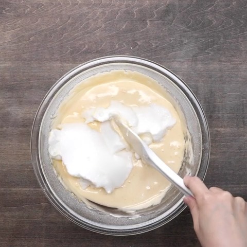 6.メレンゲを1/3量をすくって(5)のボウルに入れ、泡立て器でよく混ぜる。ゴムベラに持ち替えて残りの卵白を2回に分けて加え、気泡をつぶさないようにしてさっくりと混ぜる。