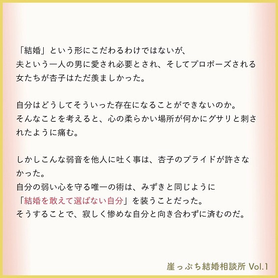 天が与えてくれたかもしれないその二物だけでは、結局心の寂しさは埋まらない。 . . 「結婚」という形にこだわるわけではないが、夫という一人の男に愛され必要とされ、そしてプロポーズされる女たちが杏子はただ羨ましかった。 .