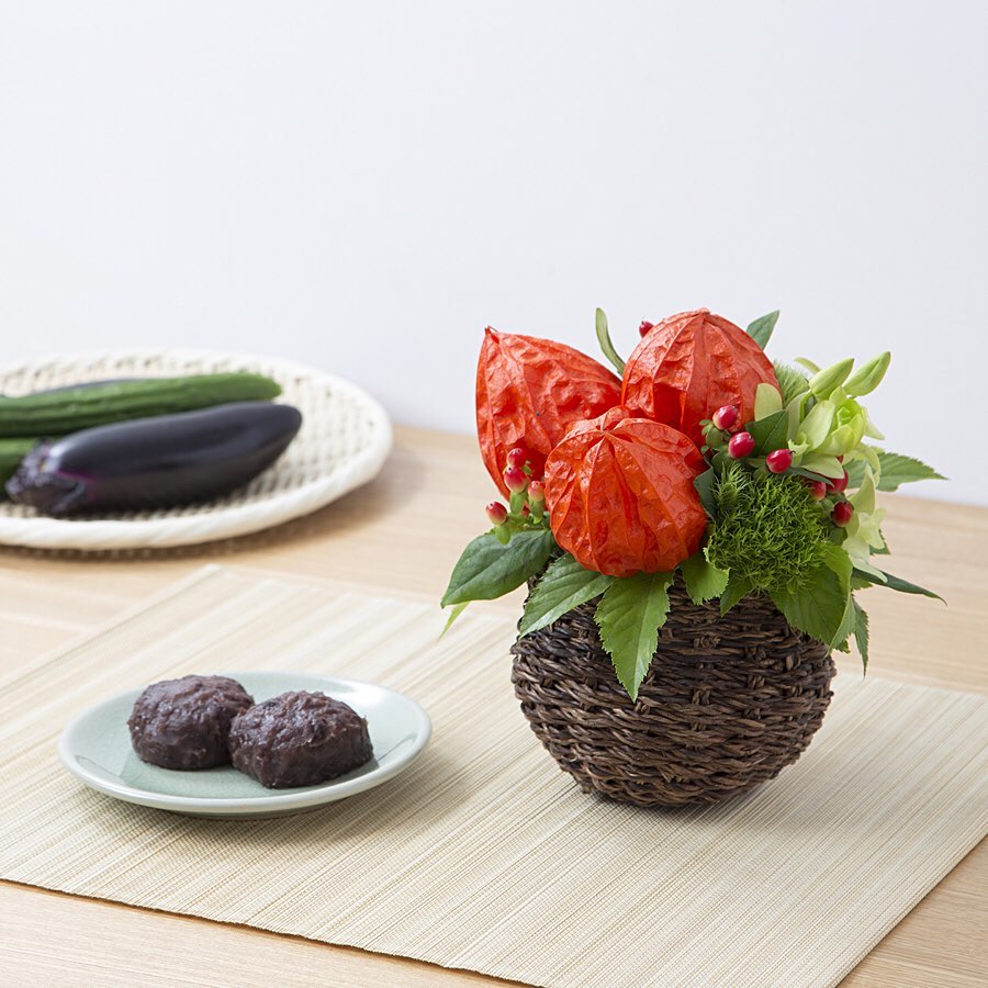 ほおずきやひまわりなど季節の花を使ったアレンジメントをご用意しています。ほおずきは、お盆のときにご先祖様が迷わず帰ってこられるよう灯す、盆提灯に見立てて飾られます。