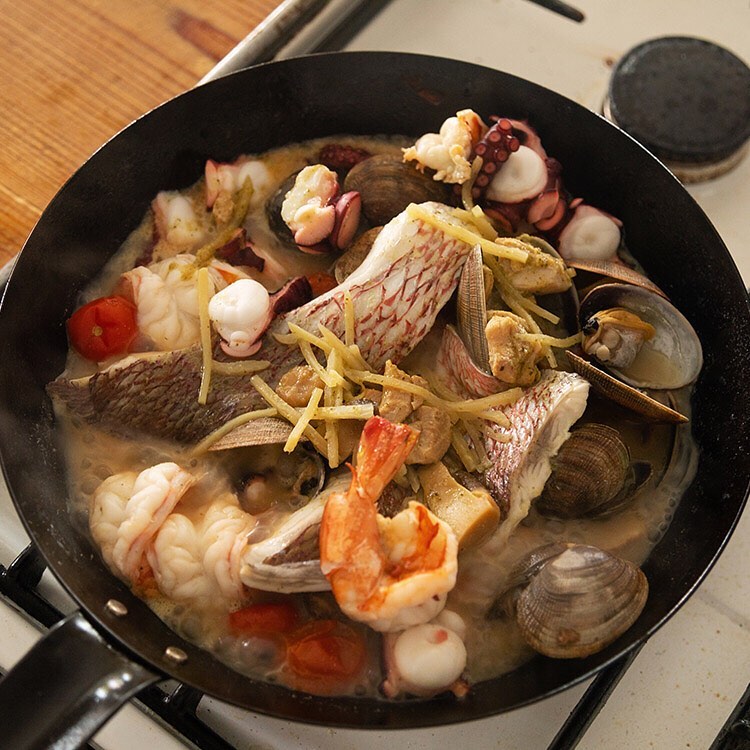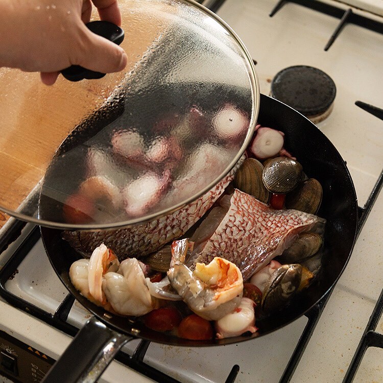 3)2に鯛の切り身と砂抜きしたあさり、ぶつ切りにしたゆで蛸、背開きにした海老、プチトマトを加えます。白ワインを注ぎ、フタをして弱火で5分蒸し焼きにします。
