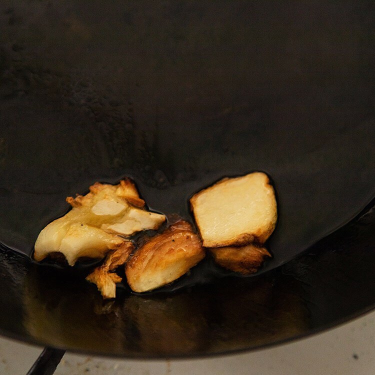 2)フライパンに潰したにんにくとオリーブオイルを入れ、弱火で香りを出します。
