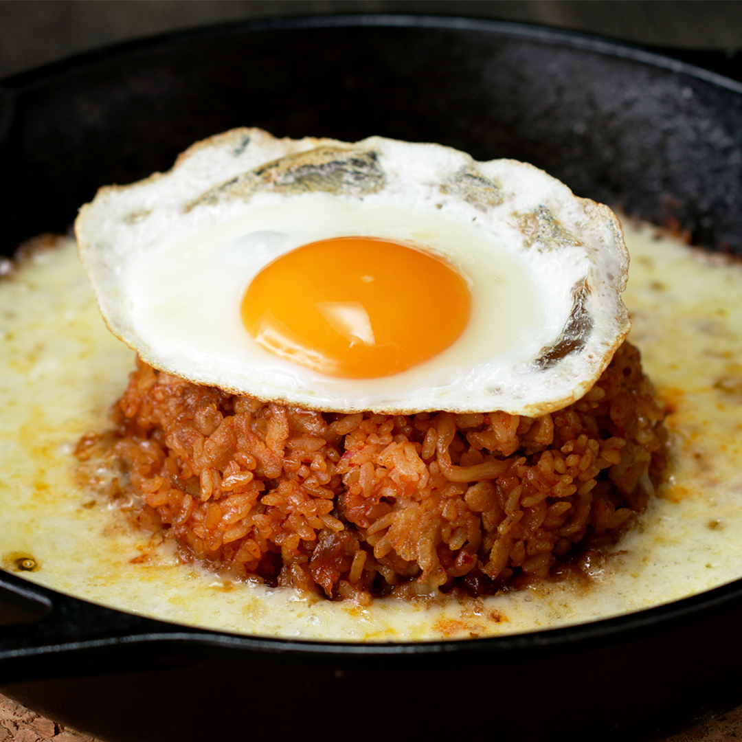 5.茶碗にキムチ炒飯を詰めて、(4)の中心にこんもりと盛る。仕上げに目玉焼きを乗せたら、完成!