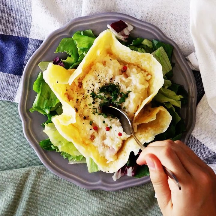 1.フライパンにクッキングペーパーを敷き、とろけるチーズを全体に入れ加熱する。⠀