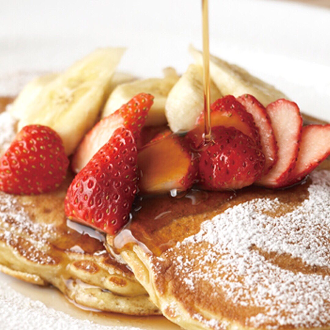 1】「サワークリームパンケーキ」サワークリームを練りこんだシルバーダラーパンケーキを3枚重ねにして、イチゴとバナナをトッピング。