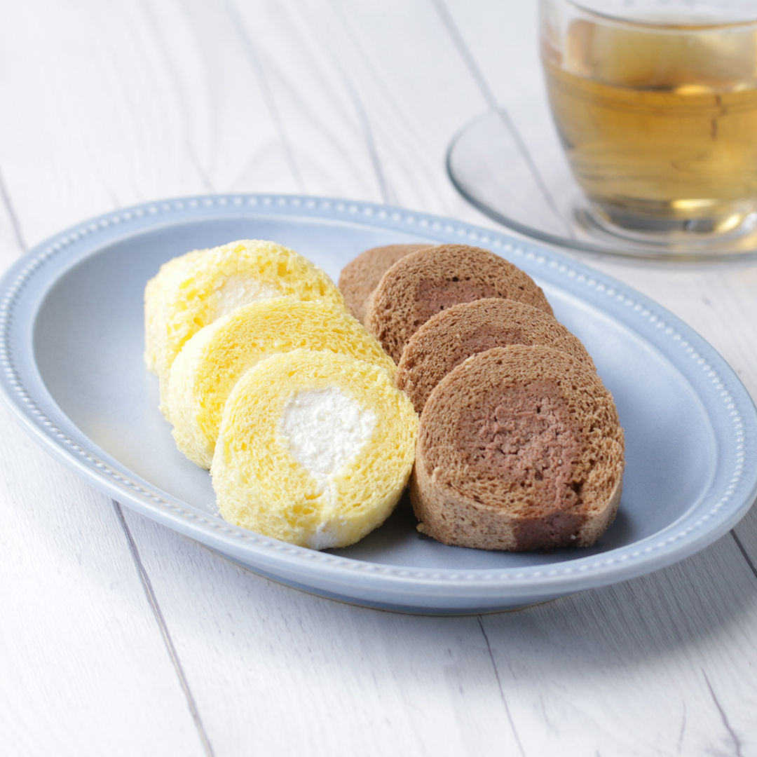 6.ラップを広げてプレーン生地をのせ、表面にホイップクリームを塗って手前から巻きつけ、冷蔵庫で30分ほど冷やす。(同様にココアロールケーキも巻く。)好みの大きさに切り分けたら、完成!