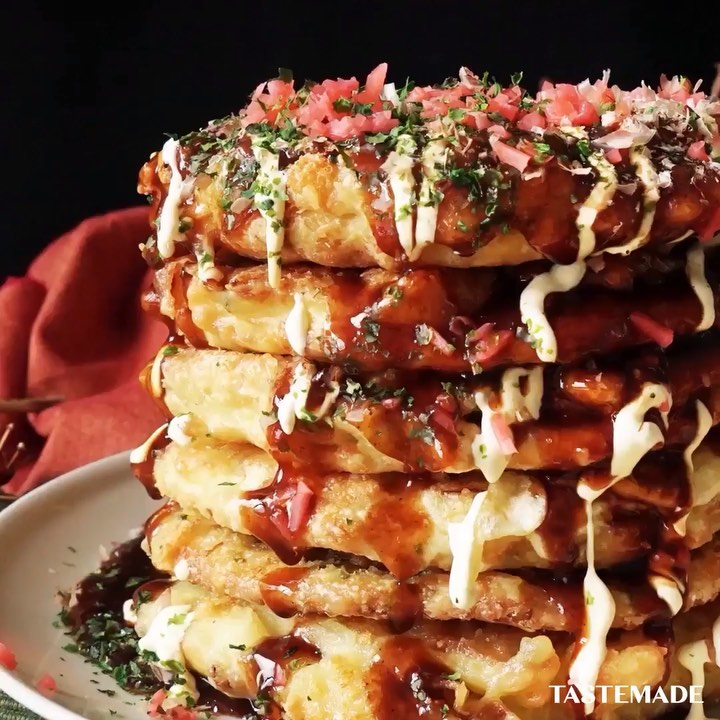 6.6枚を積み重ねたら上からだしソース、鰹節、紅生姜、青のりをふりかけ完成!⠀⠀