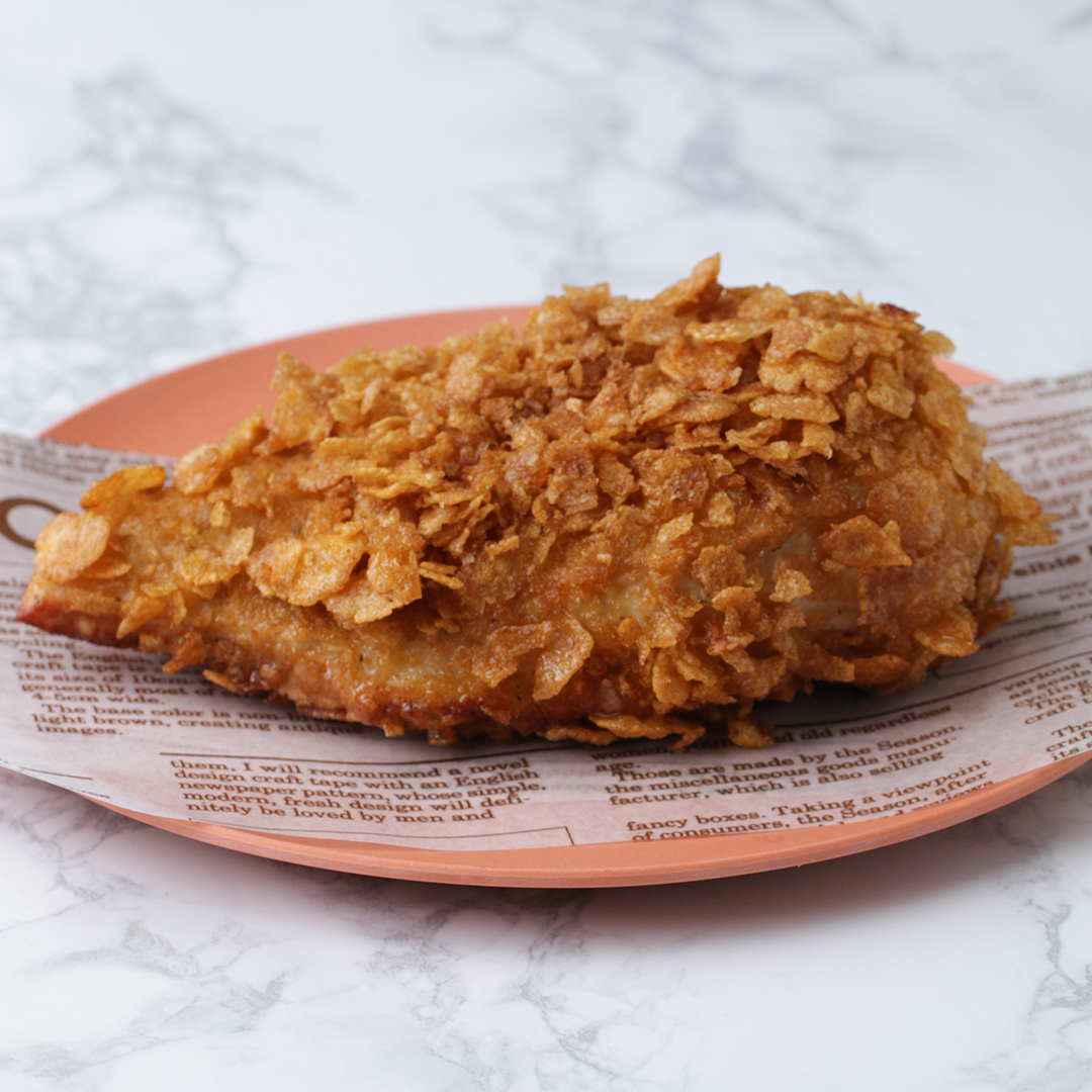 4.別のボウルに卵、薄力粉、牛乳を入れて混ぜ、(3)を浸けてコーンフレークをまぶす。