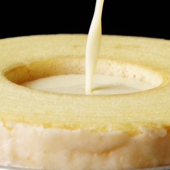 3.型に入れたバームクーヘンの穴にプリン生地を流し込み、冷蔵庫で冷やし固める(60分〜)⠀