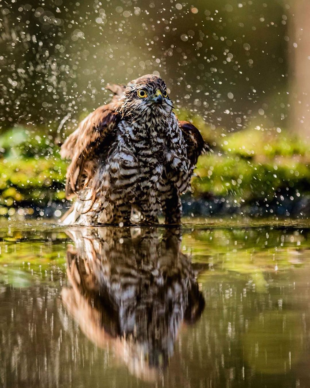 @seanweeklywildlife // The Sparrow-Hawk is a clean bird and bathes fairly regularly, but it is a matter of great luck to be able to watch one in a completely wild state. I was photographing Red Squirrels in the Netherlands and whilst in the hide I spotted this female Sparrow hawk fly through the woodland a couple of times so I was hoping to get a shot of that, but I never expected her to land just a few metres away from me!