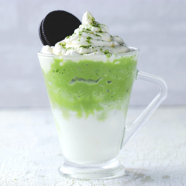 3. ホイップクリームを絞ってクッキーを添え、抹茶をかけたら、完成!