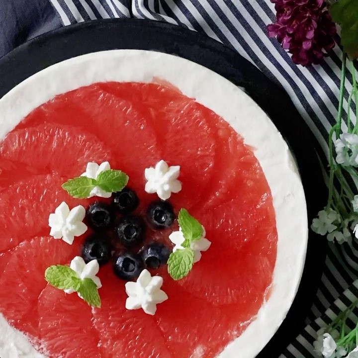 3. 15cmのケーキ型に、グレープフルーツの実を並べてブルーベリーを中央に置いて2を流し入れる。冷蔵庫で固まるまで冷やし、ケーキ型から取り出しておく。⠀