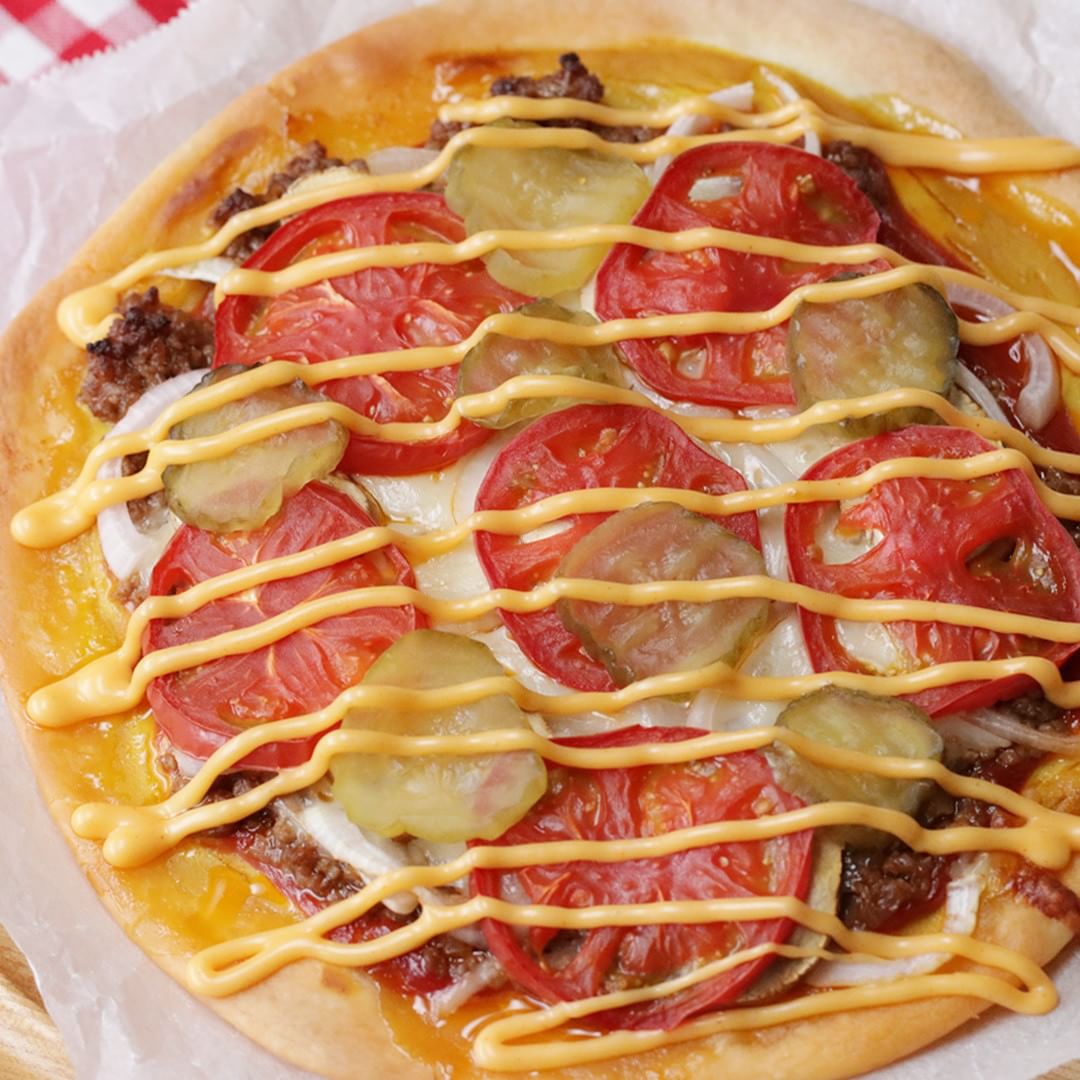 4. トースター用の天板にアルミホイルをしいてサラダ油(分量外)をうすく塗り、(3)でのばした生地をのせる。マスタードとケチャップを塗り、(2)をのせる。ピザ用チーズ、玉ねぎ、マッシュルーム、トマト、ピクルスをのせて、220℃のトースターで20分焼く。