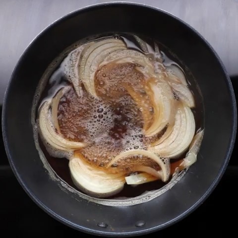 5.卵とじ丼を作る。鍋に煮汁の材料、玉ねぎを入れて火にかける。