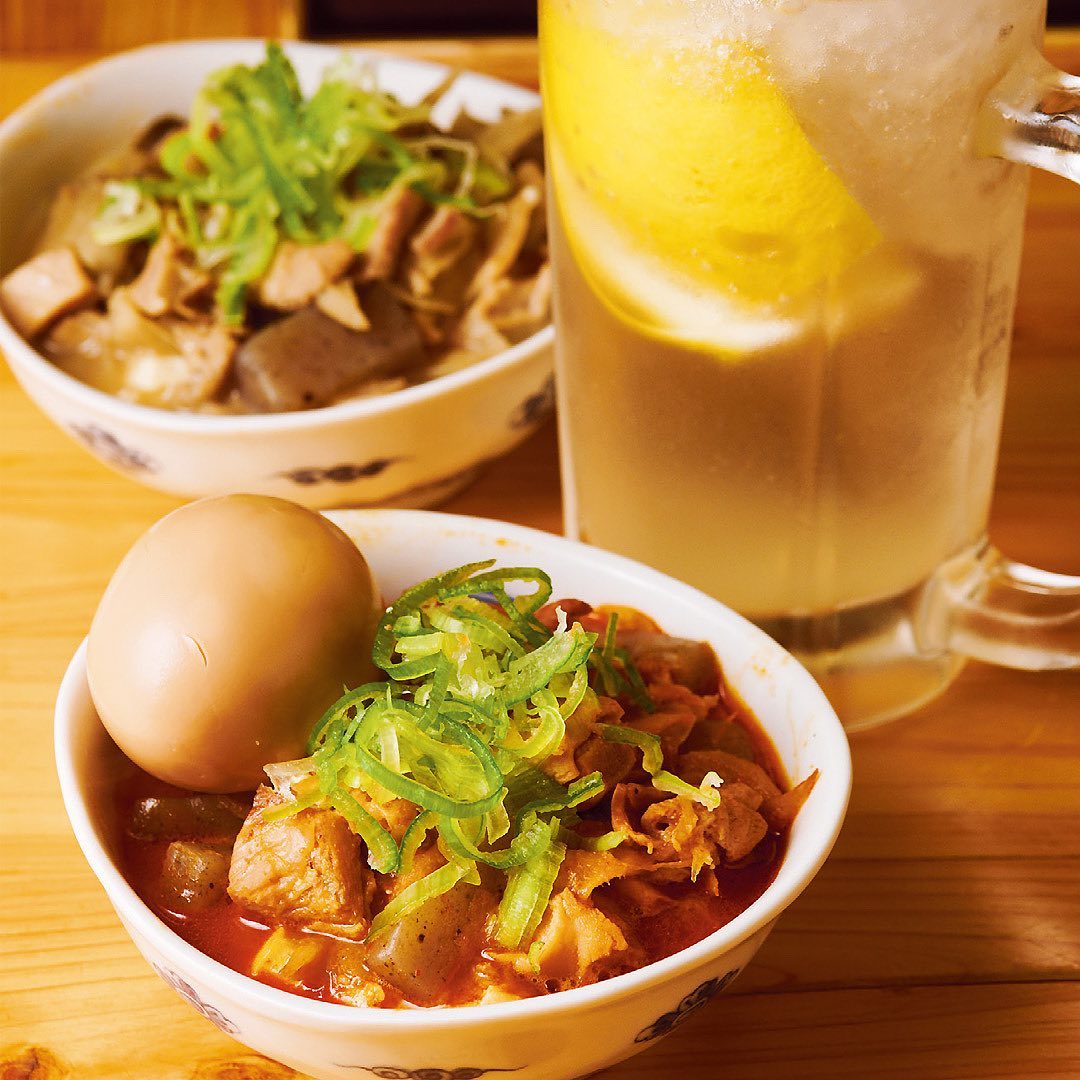 人気の「もつ煮込み赤と白」(※写真は玉子つき)は、出汁の美味さを感じる懐かしく優しい味。うっすらと塩がまぶされ、キリッとした「生レモン酎ハイ」との相性は格別だ!