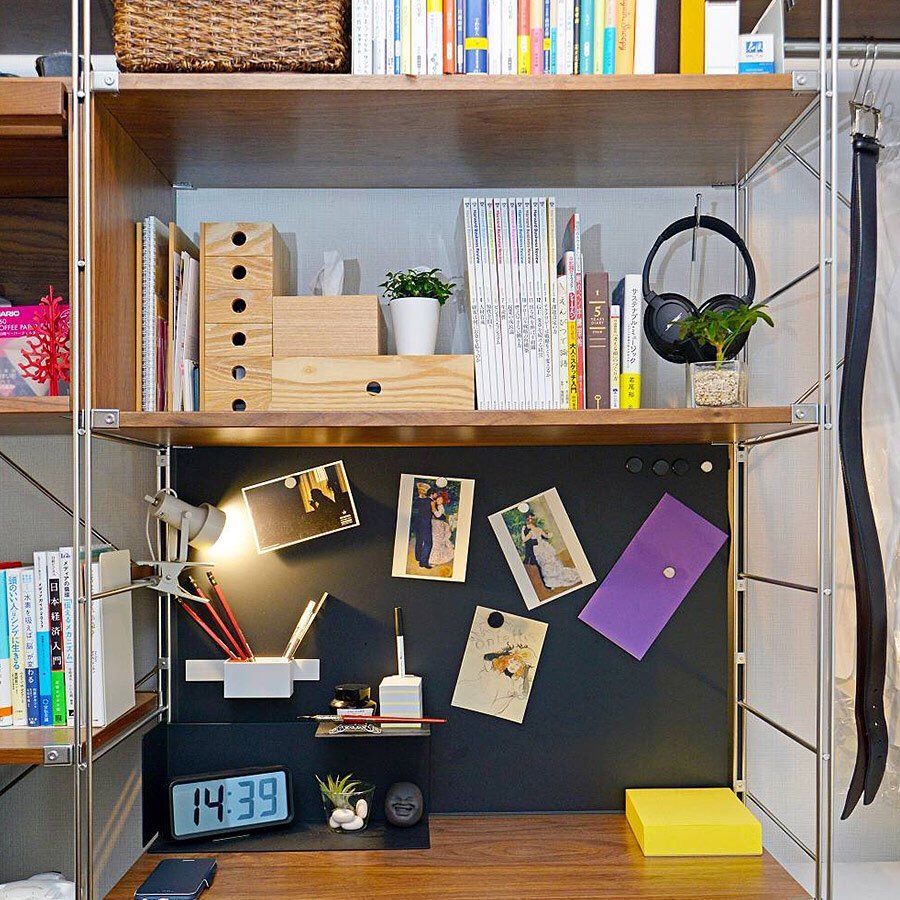 1Kの空間に、収納棚・デスク・ワードローブをすっきり収めるコーディネート。