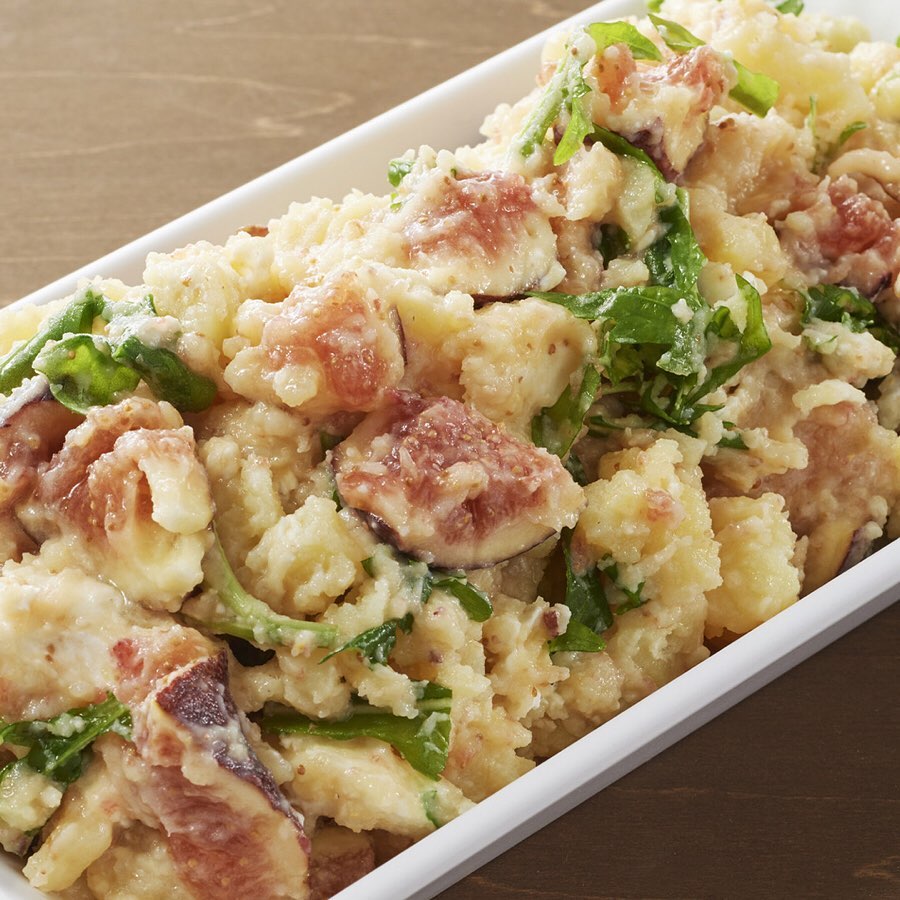 夏から秋にかけて旬となる「無花果(いちじく)」。ポテトサラダに合うよう熟度を確かめながら一つひとつ手作業で収穫したいちじくをクリームチーズと軽くつぶしたポテトと合わせて、香ばしいベーコンのソースで仕上げました。