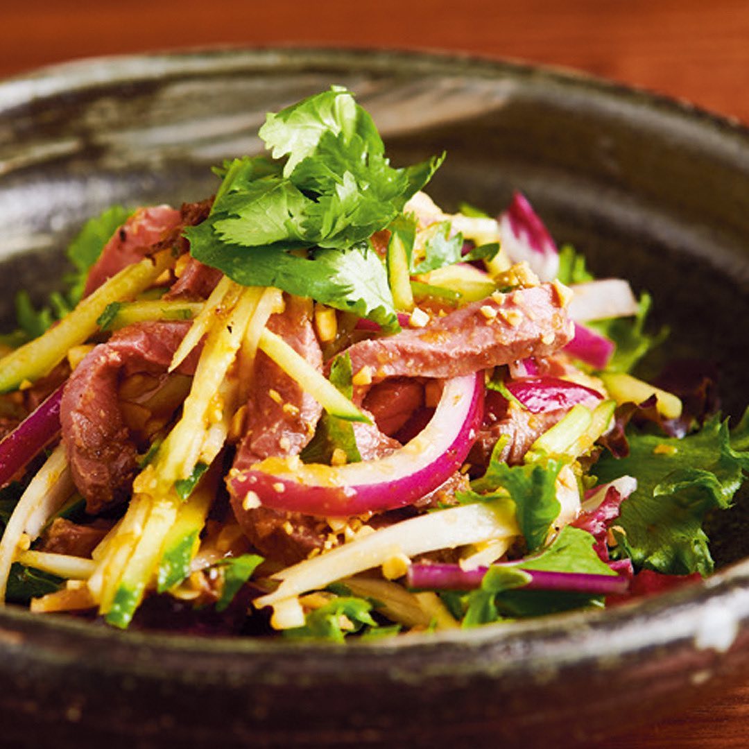 青パパイヤが爽やかな「ローストビーフと青パパイヤのXO醤サラダ」は、最近話題のジョージアワインとも合いそうである。一品料理は、アジアの調味料を巧みに効かせ印象的な味わいだ。