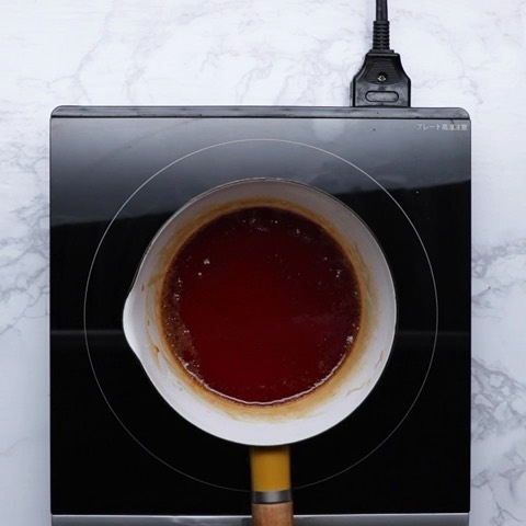 6.カラメルを作る。水にゼラチンを振り入れてふやかし、600Wの電子レンジで10秒ほど温めて液状にする。鍋にグラニュー糖、水を加えて中火にかけ、かき回さずにそのまま加熱する。周りから色付いてきたら、鍋を軽く揺すりながら茶色くなるまで加熱し、熱湯を加えてゴムベラでかき混ぜる。ゼラチン液を加えてさらに混ぜる。