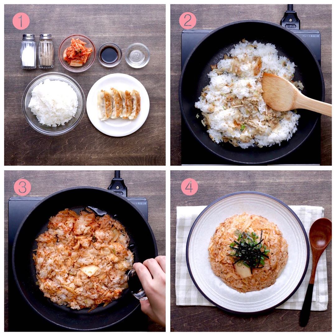 フライパンにサラダ油小さじ1を引いて中火に熱し、餃子を入れて木べらで崩し、温かいご飯を加えて炒め合わせる。