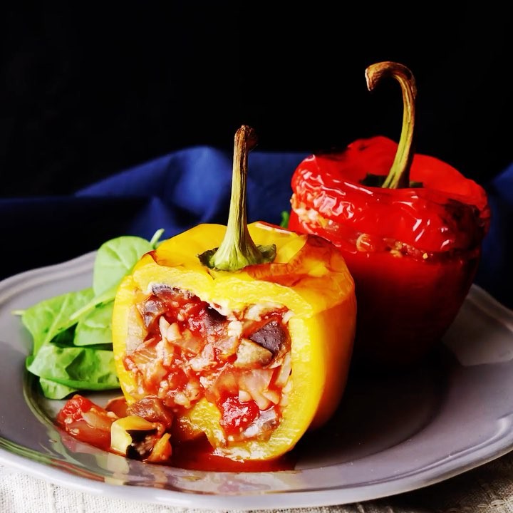 4. パプリカの中に3を入れ、粉チーズをかける。ヘタで蓋をして、オーブン200℃で25分間焼く。(パプリカの皮に焼き色がついて、シワが寄ったらOKです。)⠀