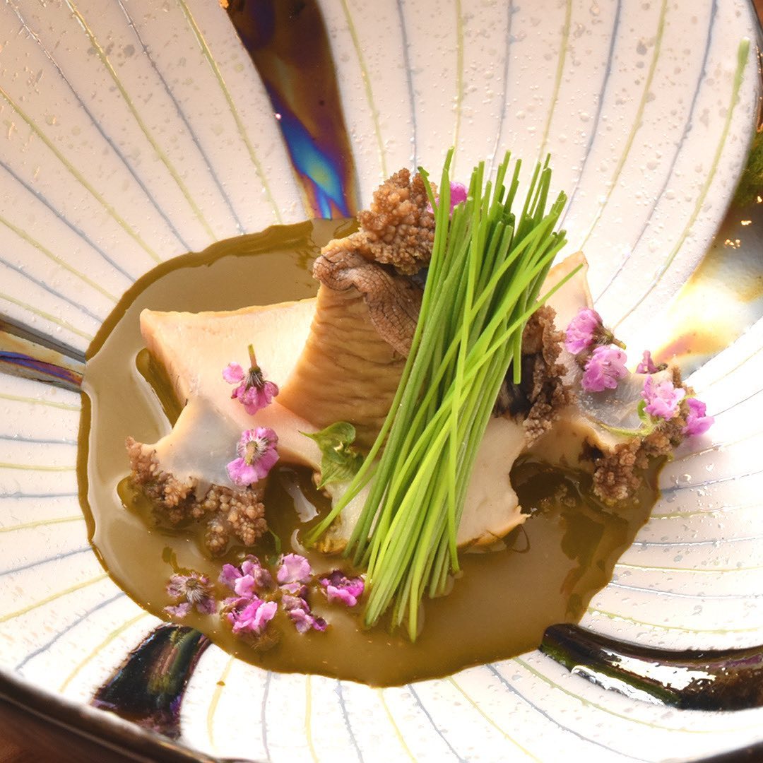 北陸の海の幸と江戸前の技術が融合し、新たな美味しさを生み出した新店だ。自社栽培の野菜を使用した料理に、黒鮑の酒蒸し、香箱蟹や能登牛まで味わえる贅沢なコースを提供している。