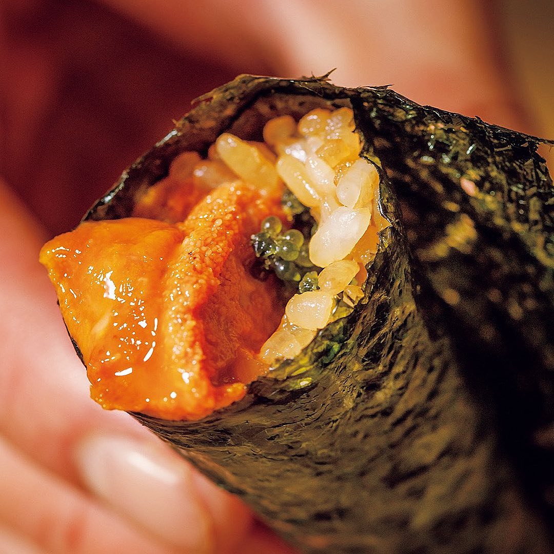 ひと品目に出される「ウニと海ぶどうの海苔巻き」は、ふたつの海の風味が重なる相乗効果のほか、海ぶどうのプチプチ食感がいいアクセントに。