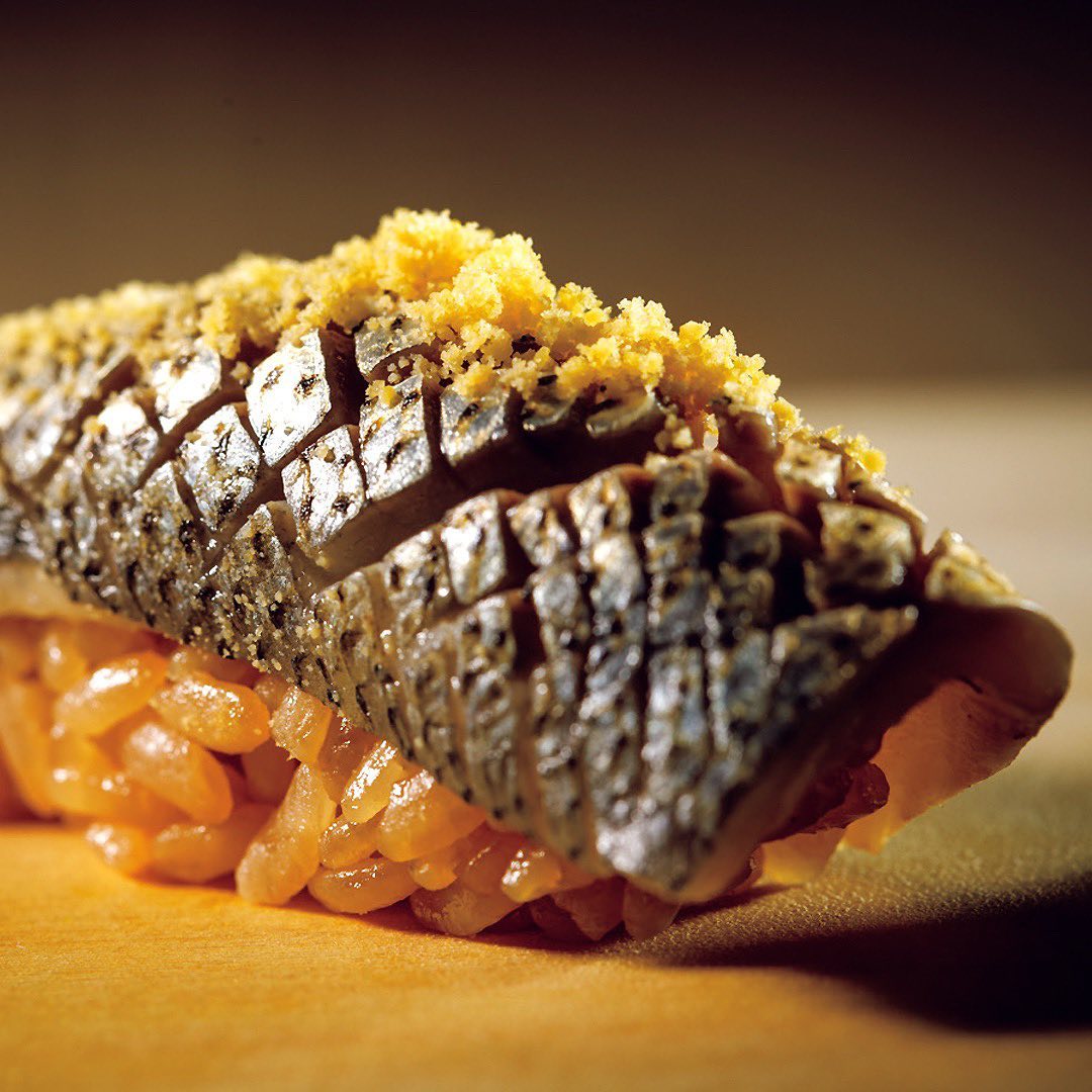 一週間寝かせた「コハダ」は旨みと酸味のバランスが秀逸。そのコハダに奥深い味わいを潜める赤酢の酢飯が完璧にマッチ。