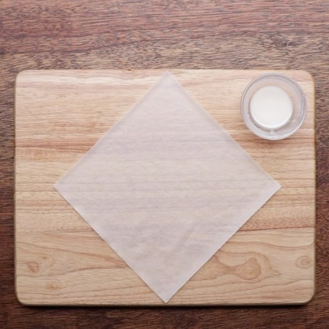 4.春巻きの皮にスライスチーズを1種類ずつ重なるようにのせ、スプーンで(2)をのせて巻く。巻き終わりに(3)を塗ってしっかりとじる。
