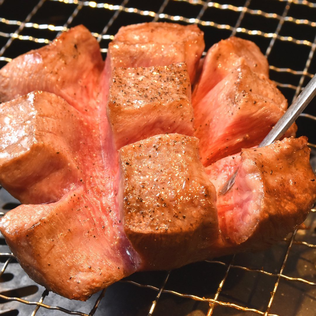 数量限定の「厚切りタンステーキ」は、テーブルへと運ばれてきたその迫力のビジュアルに歓声があがること間違いなし!豪快に分厚くカットされた牛タンに、サイの目状に包丁を入れてそのまま網の上で焼き上げていく。