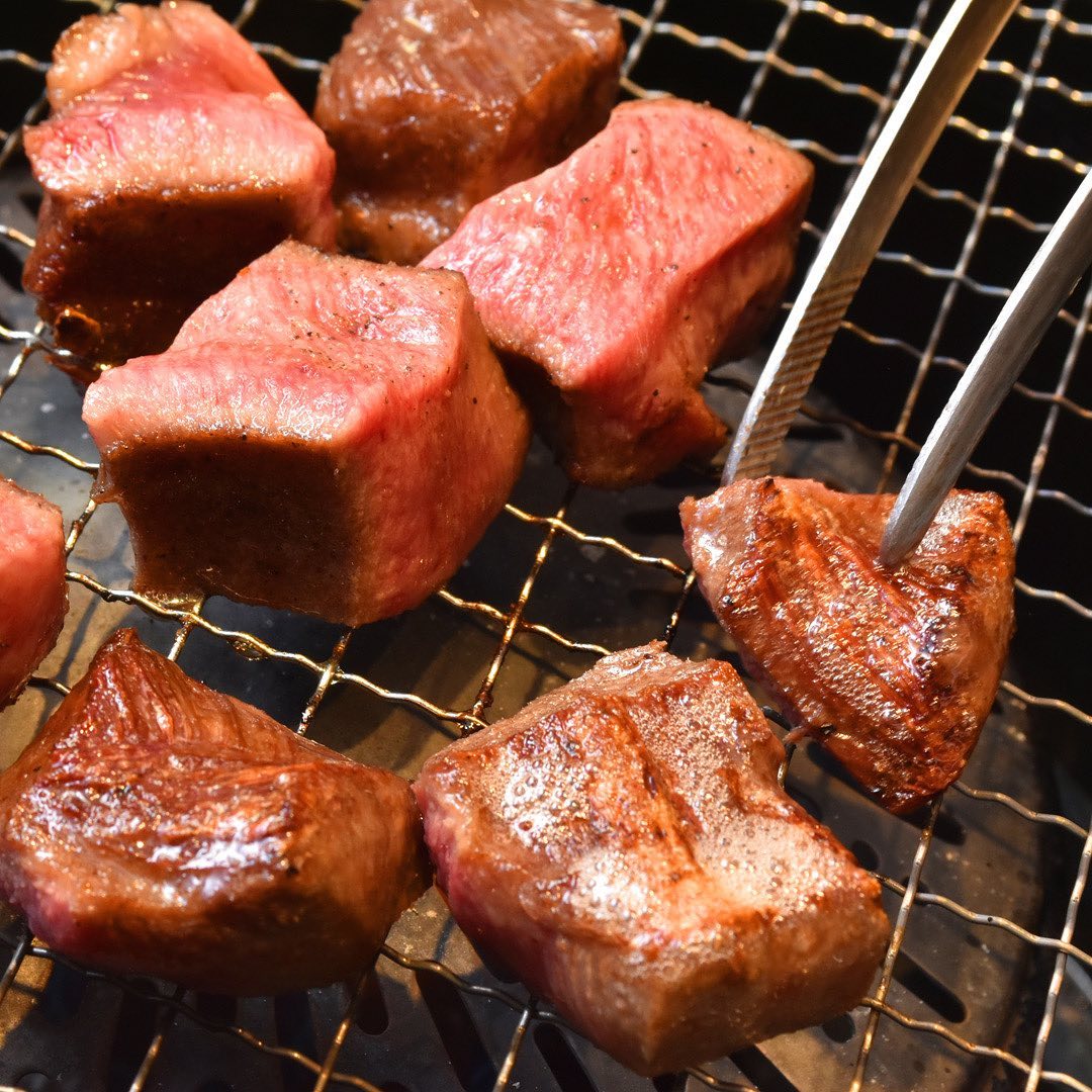 程よく焼き色が付いたところで、ハサミでカットしてひと口サイズに。外側は香ばしく、中身はレアに焼き上げれば、もう食べ頃。塩、胡椒ですでに味付けは施されているので、そのまま食べてもよし、柚子胡椒やレモンだれを付けて味わうもよし。お好みで味を変えながら召し上がれ。