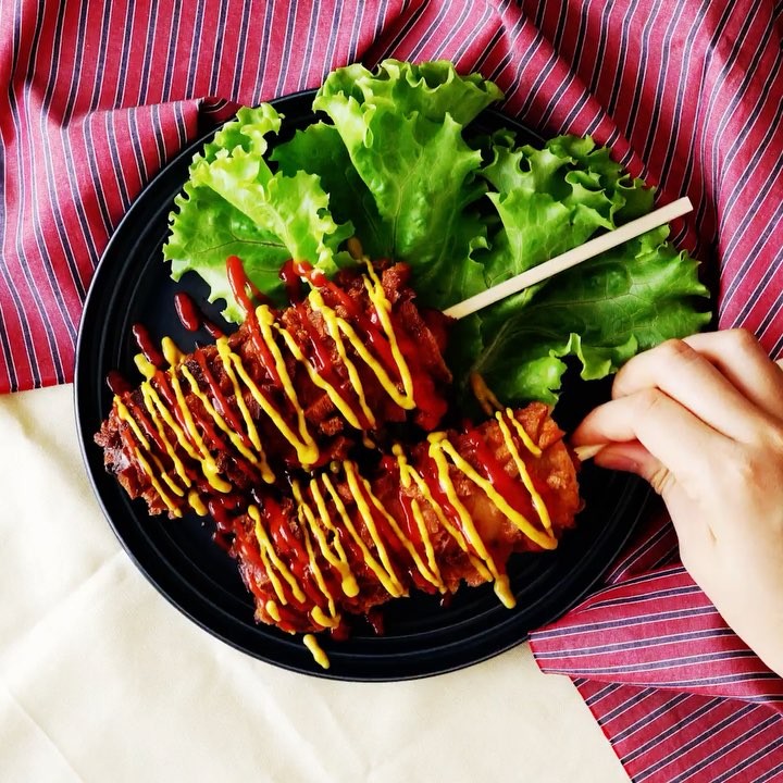 5.全体がキツネ色になったら取り出し、お皿に移してお好みでケチャップとマスタードをかけて完成!⠀