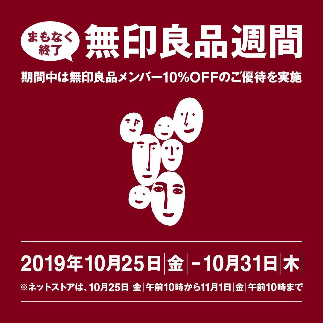 @MUJI無印良品 MUJI無印良品: 【無印良品週間】まもなく終了 無印良品メンバーの皆さまに感謝を届ける「無印良品週間」を、10月31日(木)まで開催しています。(ネットストアは11月1日(金)午… 2019-10-30 【無印良品週間】まもなく終了 無印良品メンバーの皆さまに感謝を届ける「無印良品週間」を、10月31日(木)まで開催しています。(ネットストアは11月1日(金)午前10時まで) 期間中、店舗では MUJI passport やクーポンメールの提示で10%OFF、ネットストアでのお買い物も10%OFFです。 ※他の割引との併用はできません #無印良品 #MUJI #無印良品週間 Ciao, Nihon.
