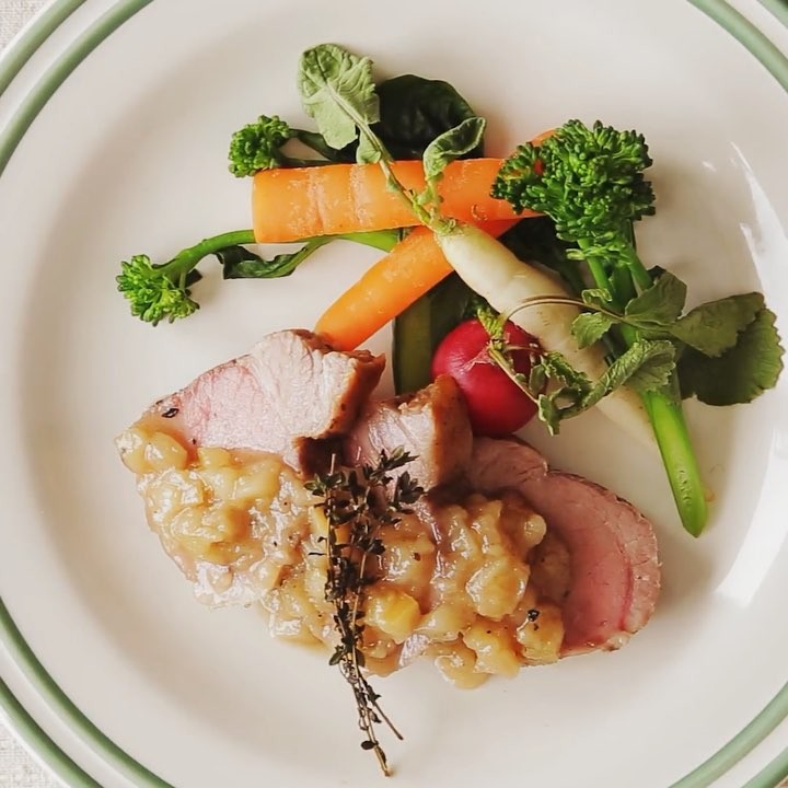 5. 器に豚肉を切り分け、④のソースをかける。好みでバターソテーした野菜を添える。⠀