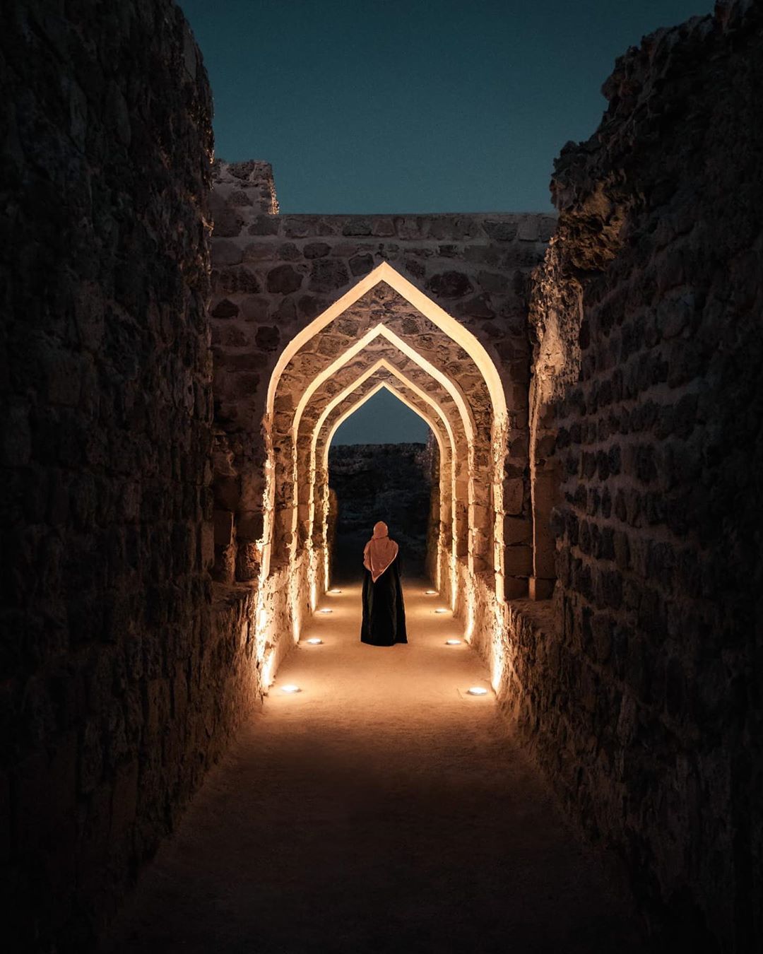 @watchluke // The Bahrain Fort (Qal’at al-Bahrain)! This epic fortress has been around since a predicted 2300 BC, and in 2005 was inscribed as a UNESCO world heritage site. The person in frame is called Nour. As she walked over to the arches her friends were telling us her name meant “light”. She stepped under the arches and just like that, as if we were in a movie the lights turned on! @tourismbahrain #bahrainalwayswarmer