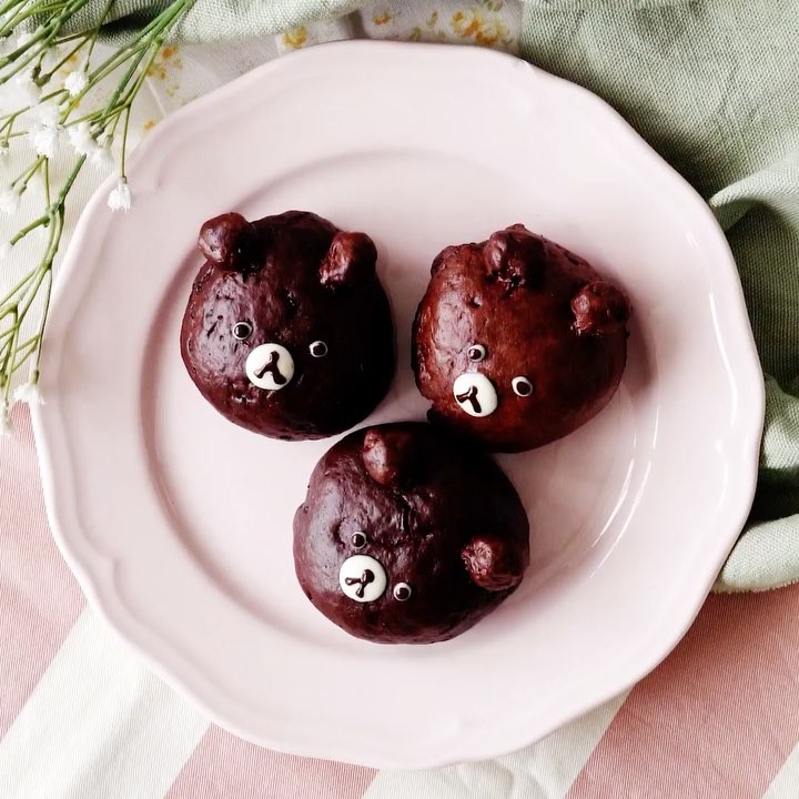 4. 生地は20g残して、チョコレートあんと共に3等分にする。生地を平たく伸ばしたら、あんを包む。5cm角に切ったクッキングペーパーの上に閉じた生地を下にしておく。20g残した生地を8等分にして丸め、包んだ生地に爪楊枝等を使ってくっつける。蒸し器に入れて、10分加熱する。⠀