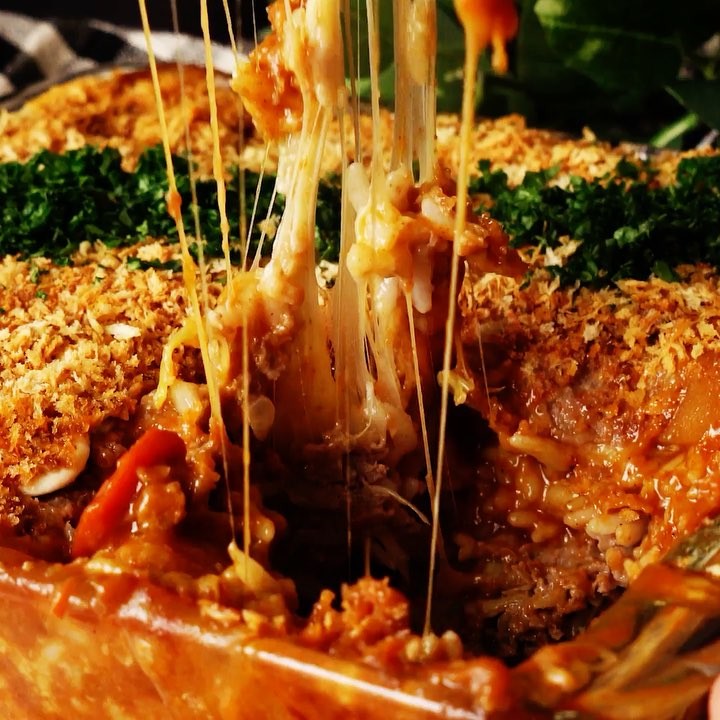 3. 耐熱のオーブン皿にメンチカツの半分→ごはん→カレー→とろけるチーズ→メンチカツの残り→パン粉を重ねる⠀
