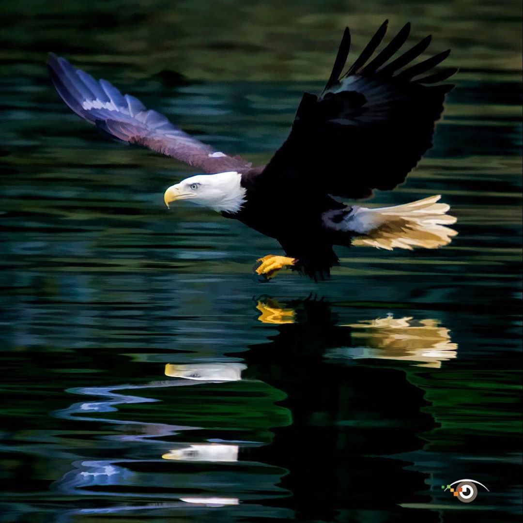 5 quick tips for bird photography from #CanonExplorerOfLight @ricksammonphotography: 1) Wings up or wings down. 2) Get the eye in focus and well lit. 3) Use a fast shutter speed to stop the action. 4) Watch the background. 5) Set a goal – here my goal was to get the full reflection of the bald eagle in the water.