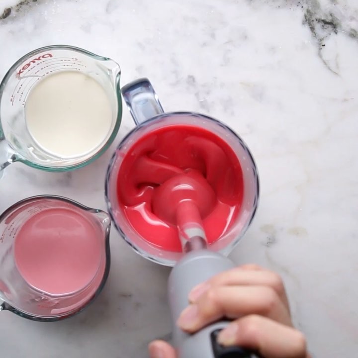 2. シリコン型にホワイトチョコムースの2/3量を入れ、少し高いところから2-3回落として空気を抜く。いちごジャムがケーキの上側になるようにして(1)をのせ、かるく押して沈める。残りのホワイトチョコムースを流し入れ、もう1枚のスポンジケーキをのせて、側面がムースで隠れるまでかるく押す。冷凍庫に一晩入れてしっかりと冷やし固める。