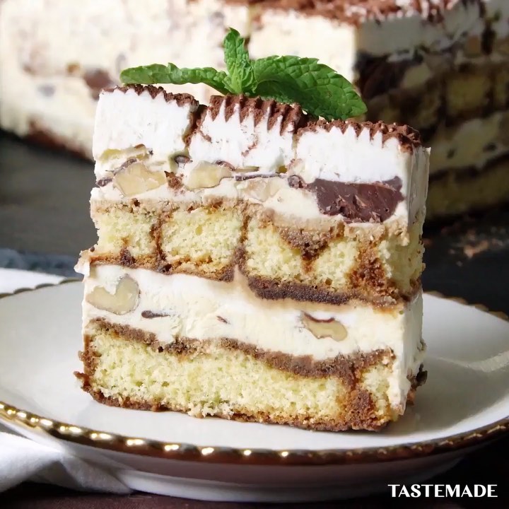 �7.カステラをしいた型に攪拌した液を半量流し込み、くるみを散らし、溶かしたチョコレートをランダムな糸状に垂らす。生クリームを上部に薄く絞り出す。もう一度、先ほどの工程を繰り返し、最後の生クリームは波状に絞り出す。⁠⠀