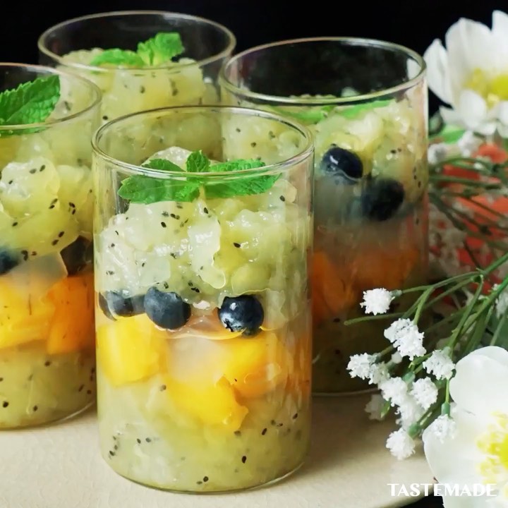 4. 固まったら3をスプーン等で崩しながら、ガラス容器に入れる。同時に、マンゴー・ブルーベリー・ナタデココもランダムに加えていく。最後にミントを飾る。⁠⠀