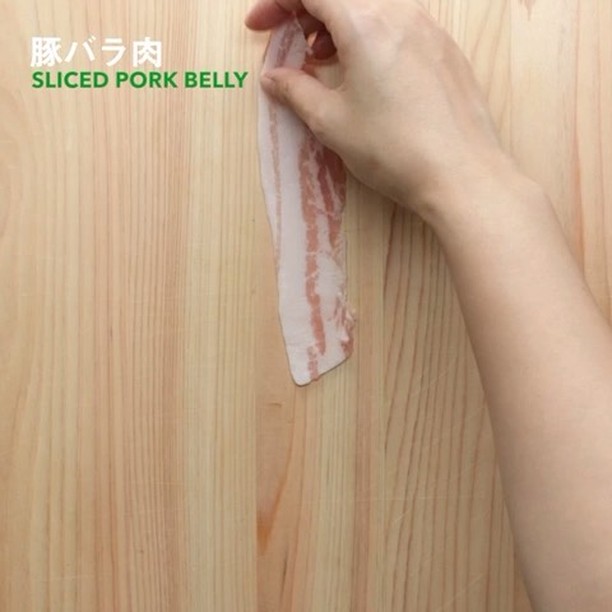 1.豚バラ肉を縦に2枚並べ、その上に半分に切った大葉を4枚のせて、手前からきつめに巻く。