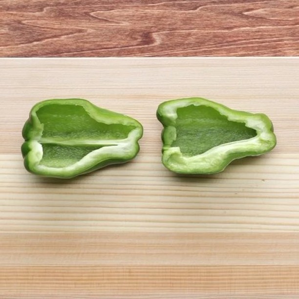1. ピーマンは半分に切って種を取り除く。折りたたんだスライスチーズを入れて、豚バラ肉を巻きつける。